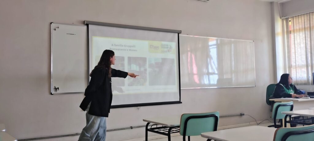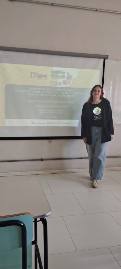 Lília Waltzer Rodrigues apresentou o trabalho intitulado “Memória da vida e trabalho rural: relações entre objetos dos acervos do Museu Gruppelli e Museu etnográfico da Colônia Maciel”. A pesquisa é realizada no âmbito do projeto “Museus de ruínas em paisagens rurais: Patrimônio Industrial na Microrregião de Pelotas”, que defende que a ruína fabril é a expressão de uma memória coletiva, fundamentando-se nos conceitos de paisagem cultural, patrimônio industrial e ruralidade. O estudo comparativo buscou valorizar o trabalho e os saberes rurais através dos acervos do Museu Gruppelli e do Museu da Colônia Maciel, localizados nos 7º e 8º distritos de Pelotas/RS, fazendo parte da paisagem e região colonial da cidade. A metodologia incluiu uma saída de campo ao Museu Gruppelli, onde foram realizadas entrevistas com o museólogo e conservador-restaurador, Gilson Barboza, que apresentou a história do museu e do acervo e explicou a funcionalidade de alguns objetos que compõem o acervo. Trechos da entrevista realizada estão sendo disponibilizados nas redes sociais do Fábrica de Memórias. Já o Museu da Colônia Maciel, embora não esteja em funcionamento devido a danos estruturais, teve parte de seu acervo exposto no III Seminário de Patrimônio Industrial, Alimentos e Sustentabilidade, realizado em maio deste ano, com o objetivo de tornar tangíveis conceitos discutidos ao longo do Seminário e visualizar objetos que narram a vida rural. Os objetos selecionados foram: tarro de leite, moedor de café, mantegueira, moedor de carne e tampador de garrafas, cada um se relacionando com a produção de alimentos de imigrantes italianos do século XIX. Alguns desses objetos também foram encontrados no Museu Gruppelli, visto que também narra a vida dos imigrantes italianos da família Gruppelli.