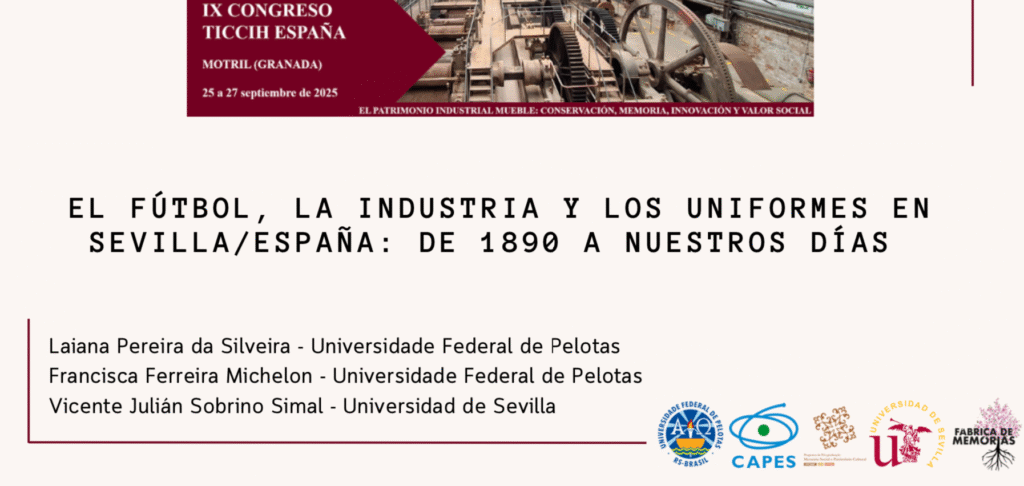 “La relación entre el fútbol, la industria y sus uniformes en la ciudad de Sevilla/España: de 1880 a nuestros días” apresentado no IX Congresso sobre Patrimônio Industrial e Obra Pública (TICCIH Espanha) em Motril, Espanha