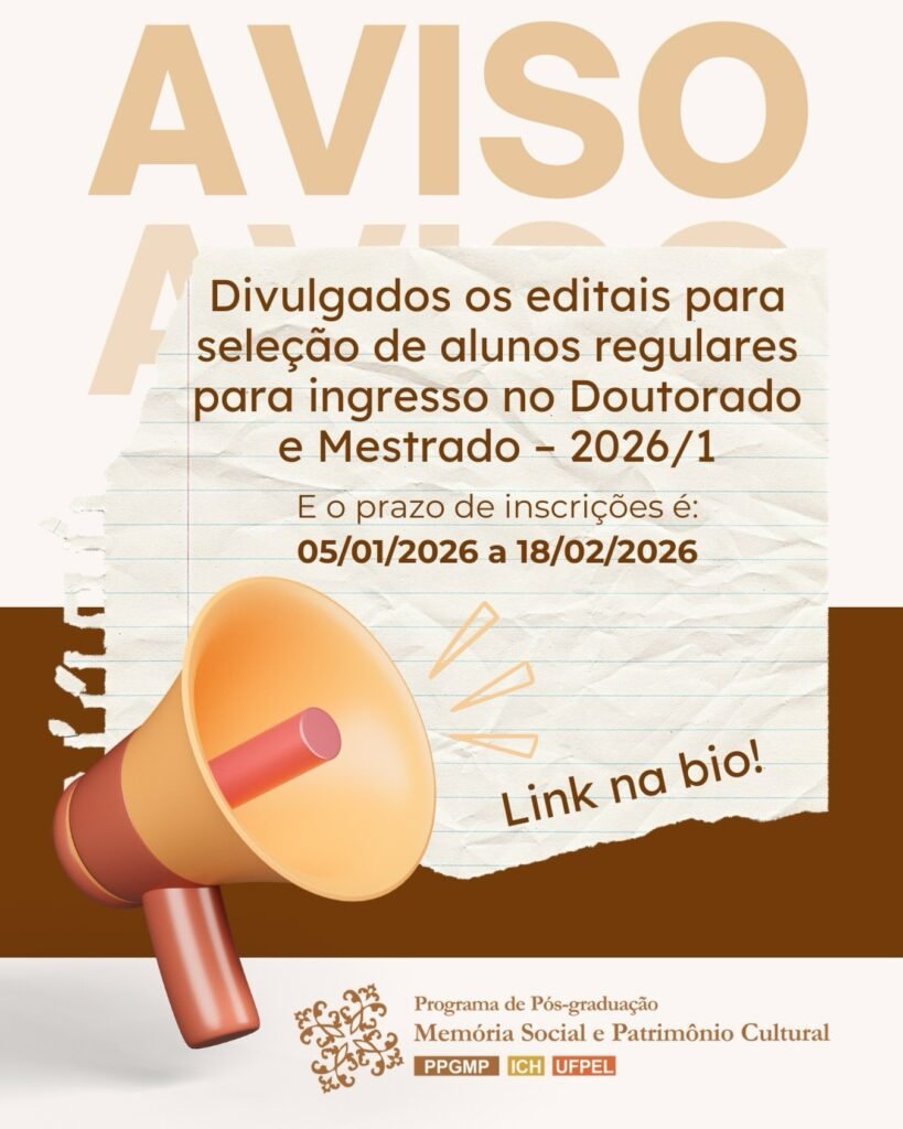 O Programa de Pós- Graduação em Memória Social e Patrimônio Cultural, da Universidade Federal de Pelotas, torna público, para conhecimento dos interessados, o processo de seleção dos candidatos para ingresso nos cursos de Mestrado e de Doutorado, semestre 2026/1, do referido Programa, nos termos estabelecidos nos Editais 261/2025 e 262/2024, respectivamente.