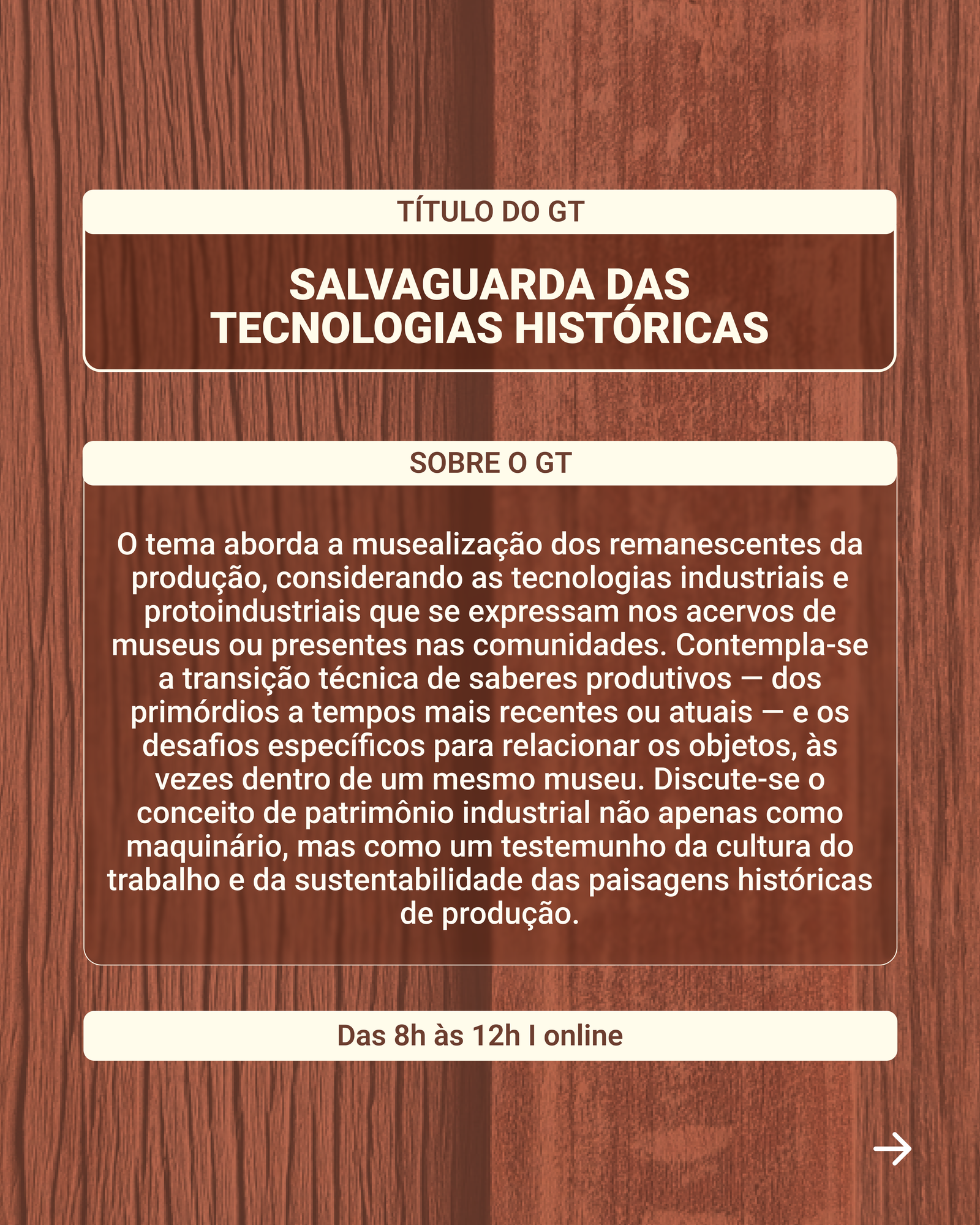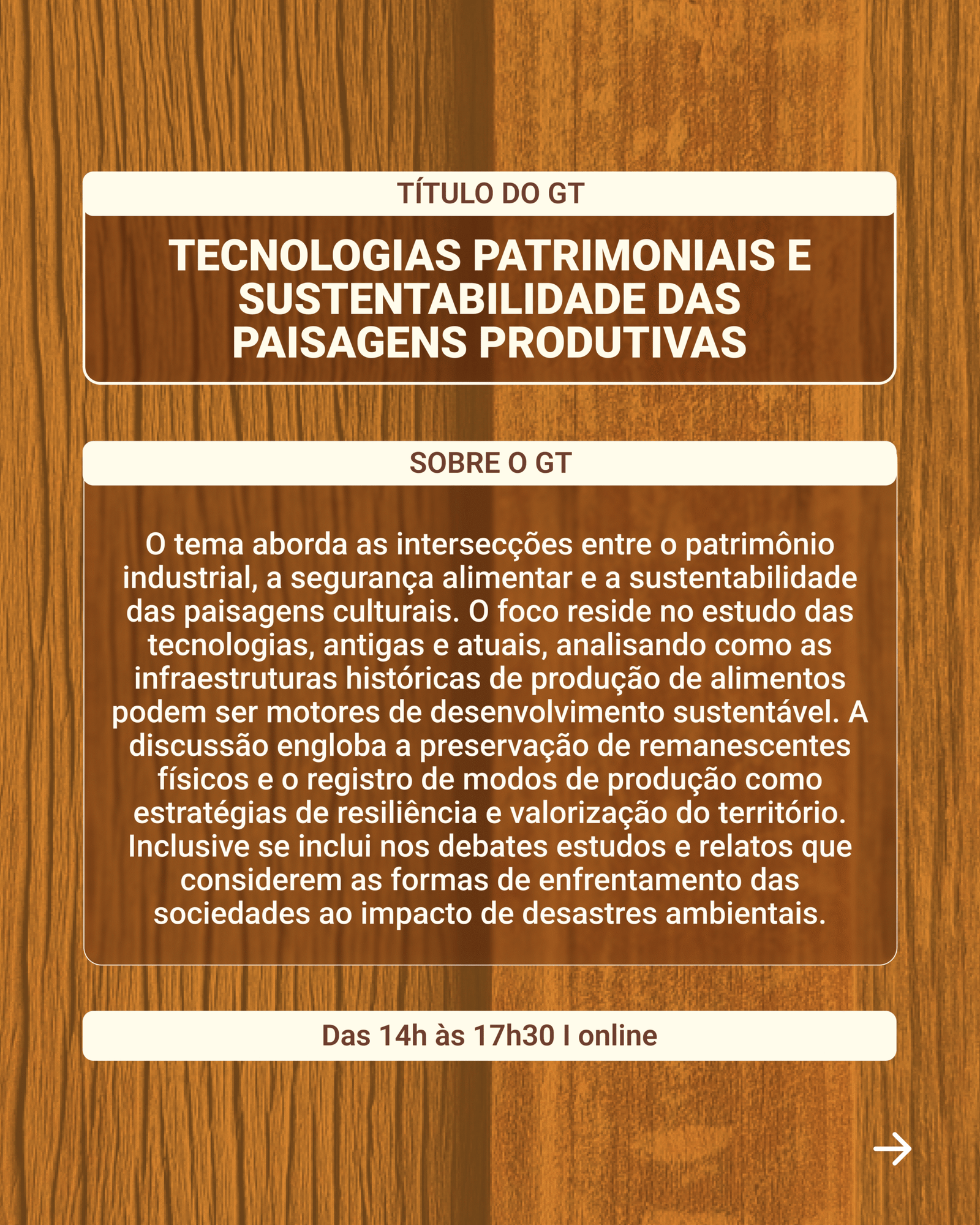 O tema aborda as intersecções entre o patrimônio industrial, a segurança alimentar e a sustentabilidade das paisagens culturais. O foco reside no estudo das tecnologias, antigas e atuais, analisando como as infraestruturas históricas de produção de alimentos podem ser motores de desenvolvimento sustentável. A discussão engloba a preservação de remanescentes físicos e o registro de modos de produção como estratégias de resiliência e valorização do território. Inclusive se inclui nos debates estudos e relatos que considerem as formas de enfrentamento das sociedades ao impacto de desastres ambientais. Também interessa a essa GT conhecer redes de cooperação que articulem a história da técnica à gestão do patrimônio, bem como ações de fortalecimento às políticas de memória voltadas para a manutenção da sustentabilidade produtiva e cultural