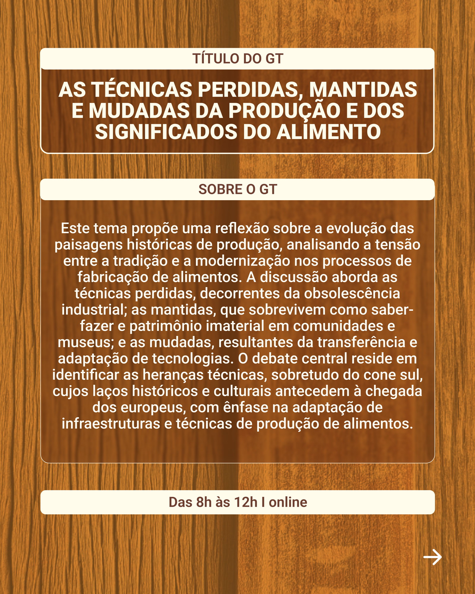 Este tema propõe uma reflexão sobre a evolução das paisagens históricas de produção, analisando a tensão entre a tradição e a modernização nos processos de fabricação de alimentos. A discussão aborda as técnicas perdidas, decorrentes da obsolescência industrial; as mantidas, que sobrevivem como saber-fazer e patrimônio imaterial em comunidades e museus; e as mudadas, resultantes da transferência e adaptação de tecnologias. O debate central reside em identificar as heranças técnicas, sobretudo do cone sul, cujos laços históricos e culturais antecedem à chegada dos europeus, com ênfase na adaptação de infraestruturas e técnicas de produção de alimentos. Também interessam estudos que observam como a mudança nos meios de produção altera os significados sociais e culturais do alimento, impactando a sustentabilidade e a manutenção da memória cultural.