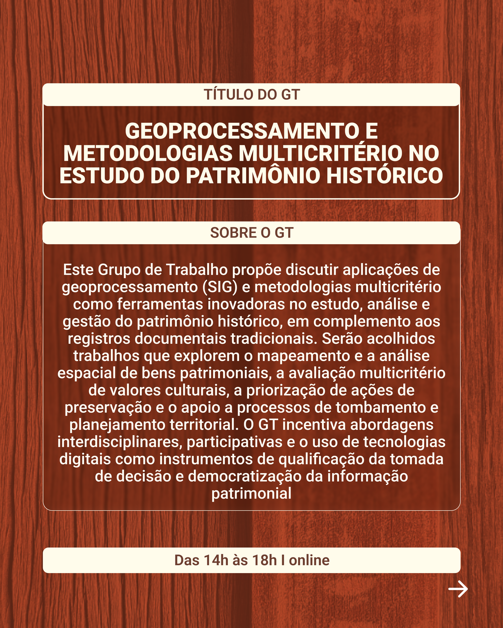 Este Grupo de Trabalho propõe discutir aplicações de geoprocessamento (SIG) e metodologias multicritério como ferramentas inovadoras no estudo, análise e gestão do patrimônio histórico, em complemento aos registros documentais tradicionais. Serão acolhidos trabalhos que explorem o mapeamento e a análise espacial de bens patrimoniais, a avaliação multicritério de valores culturais, a priorização de ações de preservação e o apoio a processos de tombamento e planejamento territorial. O GT incentiva abordagens interdisciplinares, participativas e o uso de tecnologias digitais como instrumentos de qualificação da tomada de decisão e democratização da informação patrimonial.