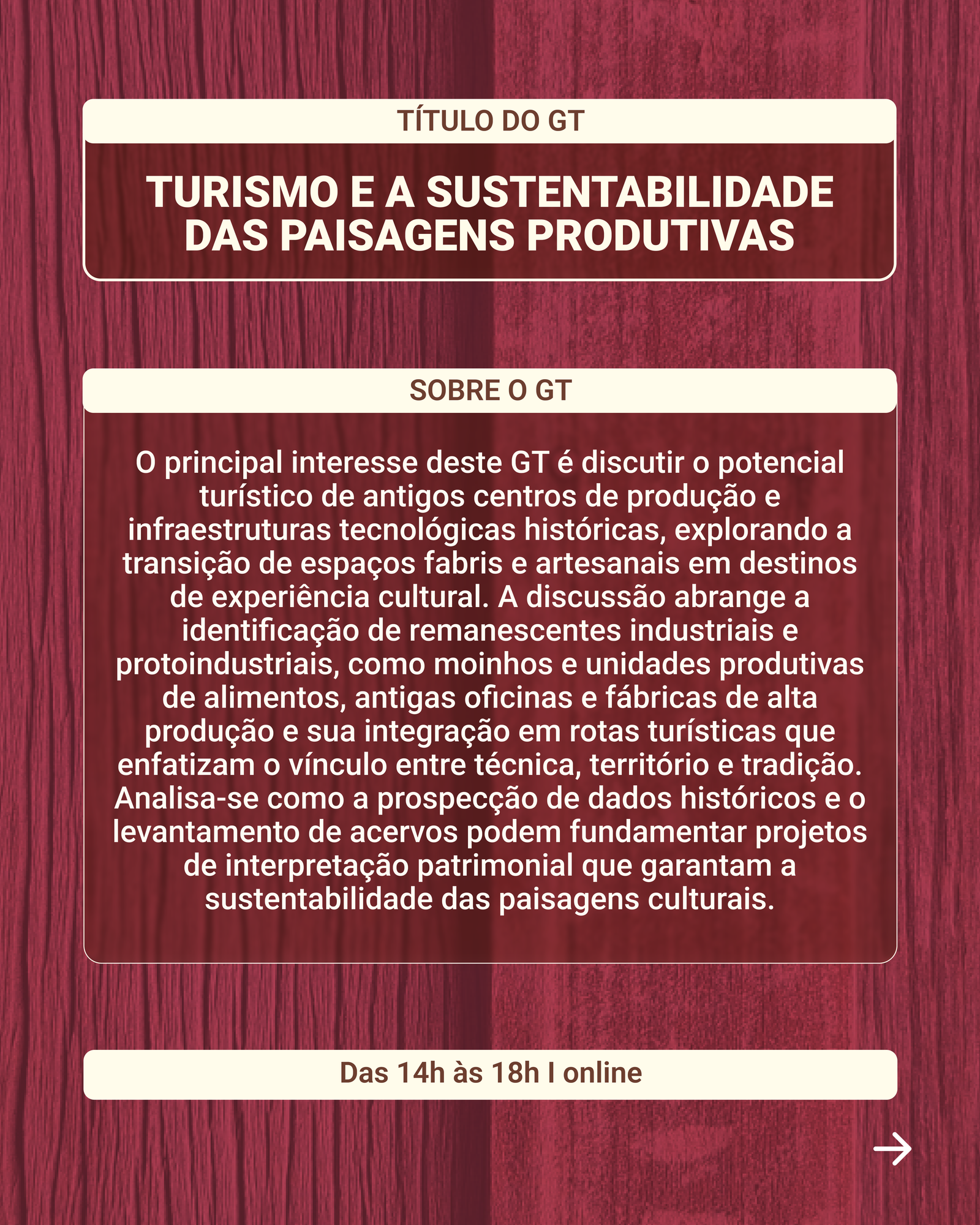 O principal interesse deste GT é discutir o potencial turístico de antigos centros de produção e infraestruturas tecnológicas históricas, explorando a transição de espaços fabris e artesanais em destinos de experiência cultural. A discussão abrange a identificação de remanescentes industriais e protoindustriais, como moinhos e unidades produtivas de alimentos, antigas oficinas e fábricas de alta produção e sua integração em rotas turísticas que enfatizam o vínculo entre técnica, território e tradição. Analisa-se como a prospecção de dados históricos e o levantamento de acervos podem fundamentar projetos de interpretação patrimonial que garantam a sustentabilidade das paisagens culturais. Busca-se discutir o turismo cultural como modo de incentivo ou de conhecimento dos patrimônios técnicos e possibilidade da geração de produtos turísticos qualificados e autênticos.